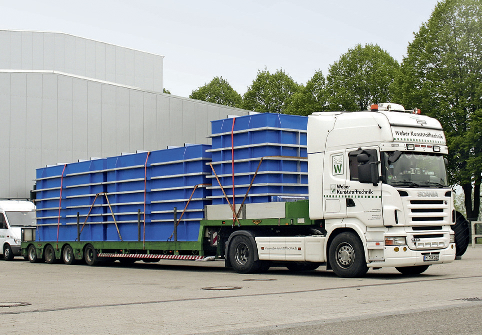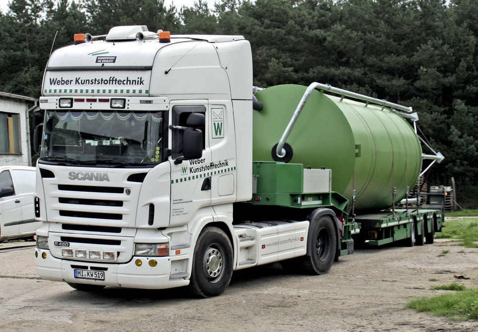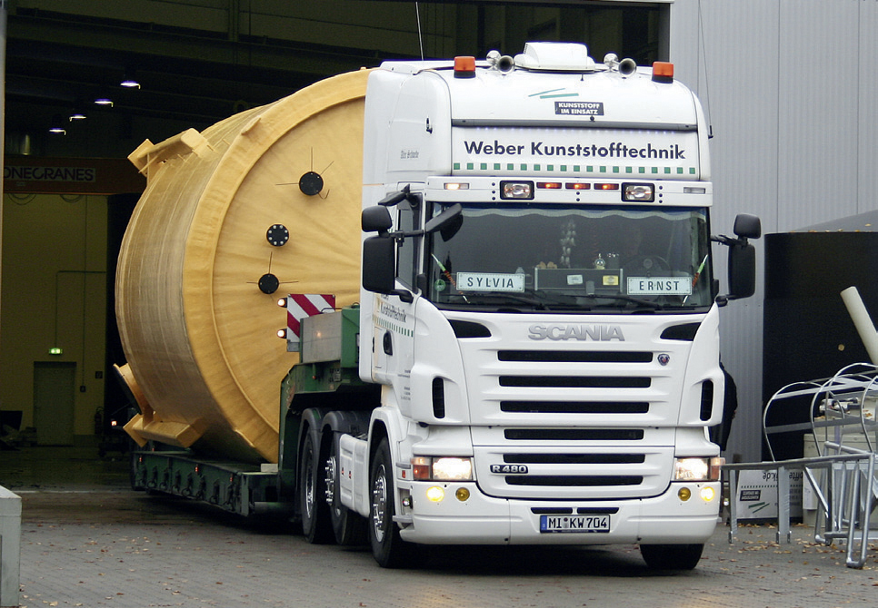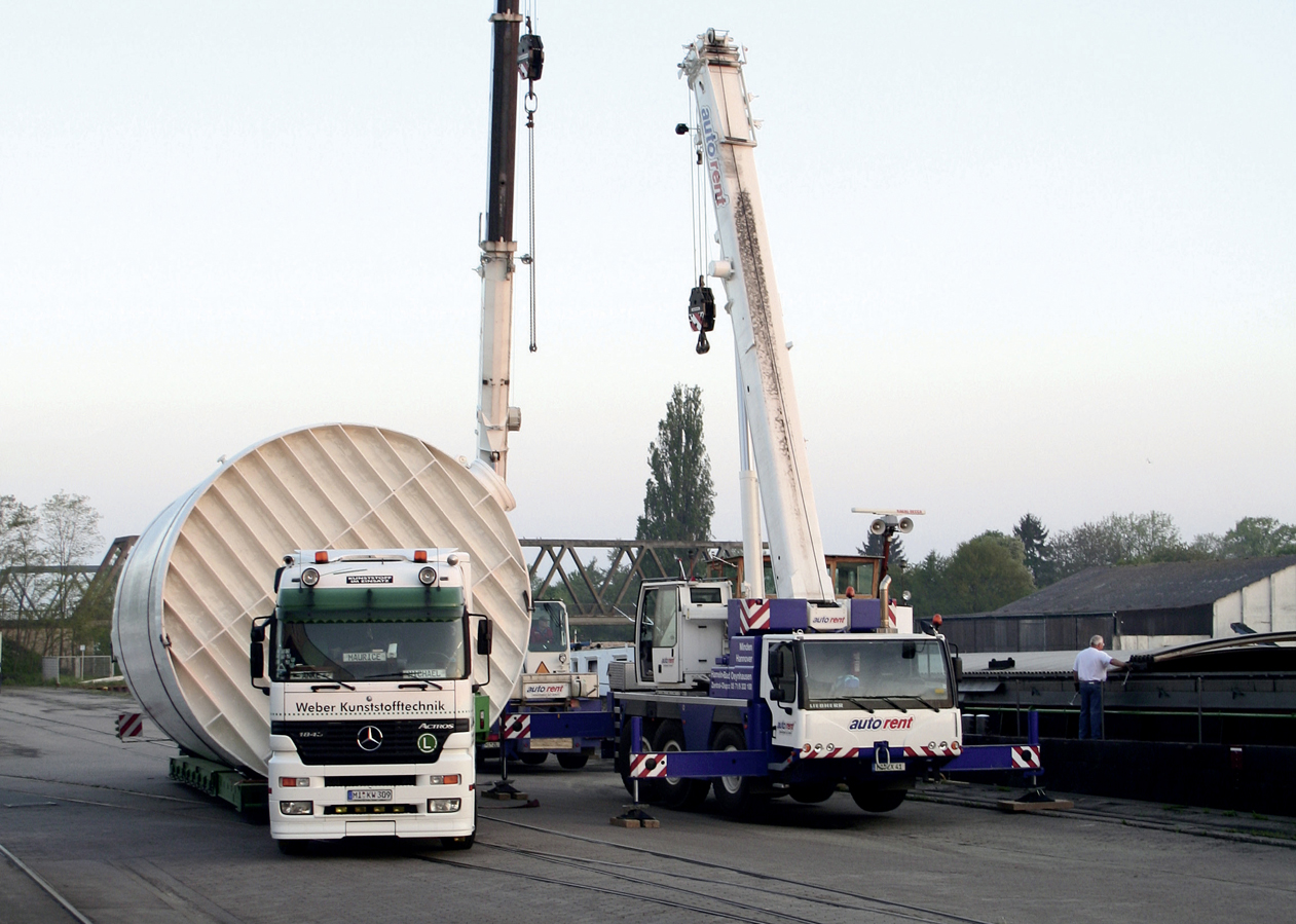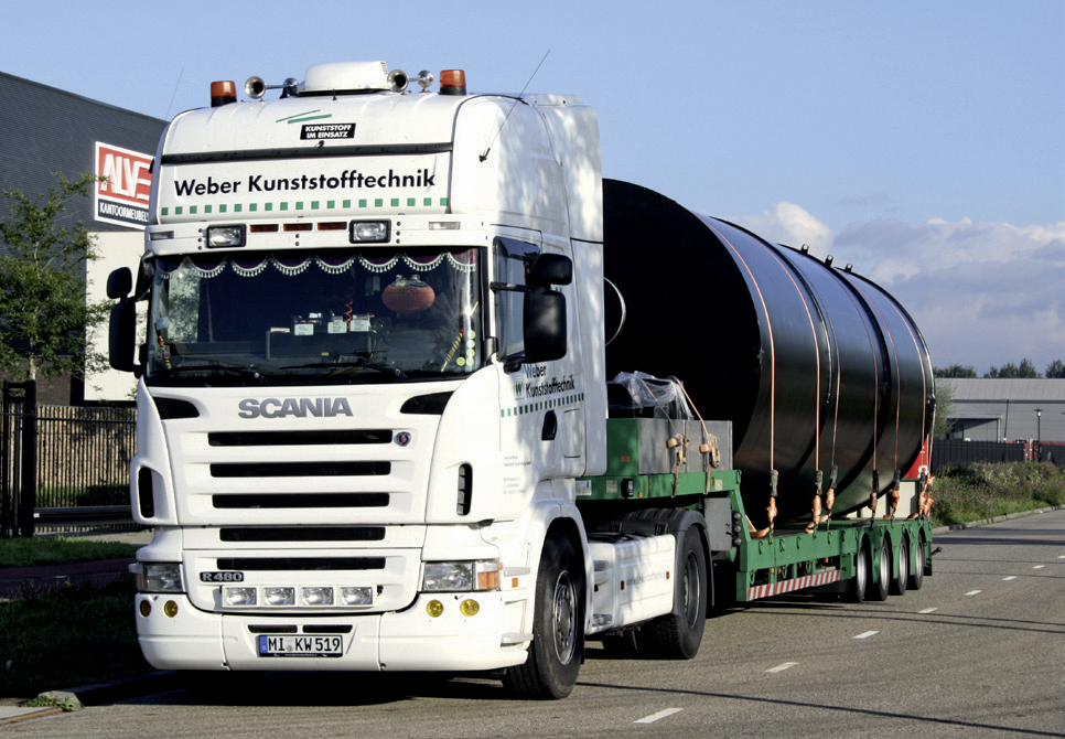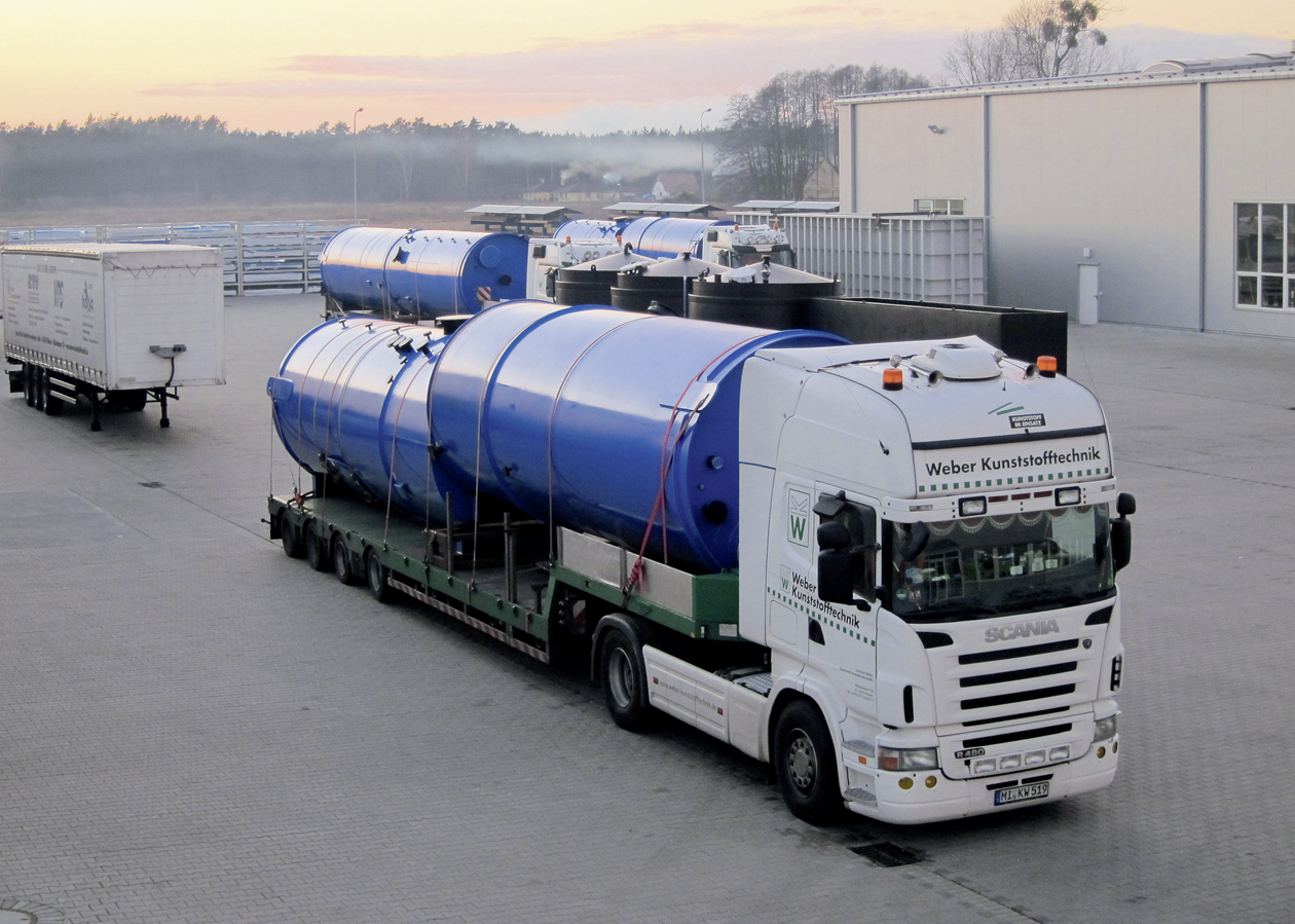 Logistik: Kontrolliert und sicher ans Ziel Flexibilität durch Spezialfahrzeuge Durch unsere auf unsere Produkte zugeschnittenen Fahrzeuge und Aufnahmevorrichtungen sorgen wir für eine sichere Anlieferung der Behälter und Anlagenkomponenten an ihren Bestimmungsort. Zum Schutz von kälteempfindlichen Produkten und Materialien (wie zum Beispiel PP) sind die geschlossenen Aufleger bei niedrigen Temperaturen während des Transportes beiheizbar. Alternativ werden unsere Produkte mit Thermoaufliegern transportiert. Zum nachhaltigen Schutz der Umwelt sind unsere Fahrzeuge auf dem neuesten Stand der Technik und erfüllen die derzeit höchste Abgasnorm EURO-6. Zur Ausstattung unseres Fuhrparks gehören: Kesselbrücken (Tiefbett) verbreiterbar und teleskopierbar Semi-Tieflader, teleskopierbar Tautliner, verbreiterbar unter Plane Impressionen: Logistik